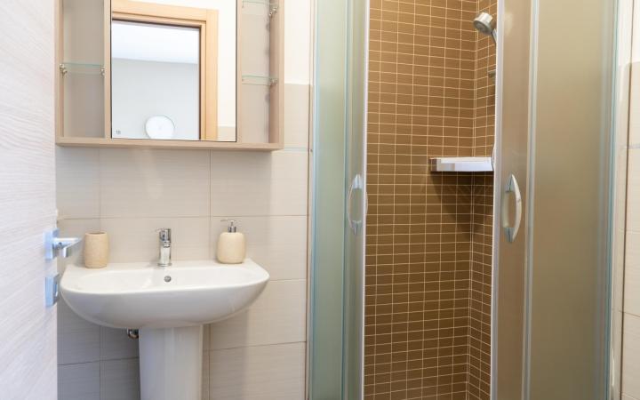 The sleeping area consists of three comfortable bedrooms, including two double bedrooms and one bedroom with bunk beds. There is also a sofa bed. One of the double bedrooms has a private bathroom. They are equipped with air conditioning and windows. The property can accommodate up to eight people.